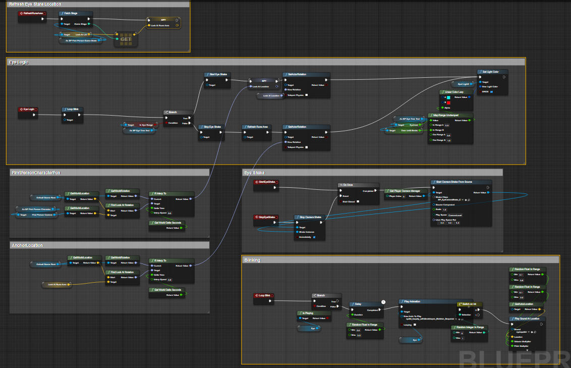 Hi, Blake here. It's been super interesting and a great learning experience working on Eye For an Eye's programming. My primary area for the game was working on Eeny's AI, and other interactive world objects, and I feel that I've come a long way since the beginning of Studio in terms of not only understanding Unreal's interface - but also what it has to offer.Creating a horror game is quite hands-on. Every minute detail of the interactions you create; the timing, volume, location etc. are more important than they would be in any other game, because you're primary objective as a Designer is to maintain that tense atmosphere and fear factor. On another note; having so many Actors housed on one map forced me to learn to better optimize my code, which was an interesting challenge, especially when Behaviour trees come into it.I've had a great time working with the team - and it's been fun to collaborate with a diverse plethora of skills all for the same idea. Coming from a team in trimester 1 that had a lot of clashing vision, I feel that I meshed much better with this crowd, and were pushing toward the same goal. Having other programmers that I can rely on has been awesome - being pleasantly surprised to open the project to a cool new system already being implemented. And as someone who isn't particularly talented in drawing, it was almost surreal to see the game come to life via concept art and more.Genuine congrats and thanks to the team for all the hard work this trimester!